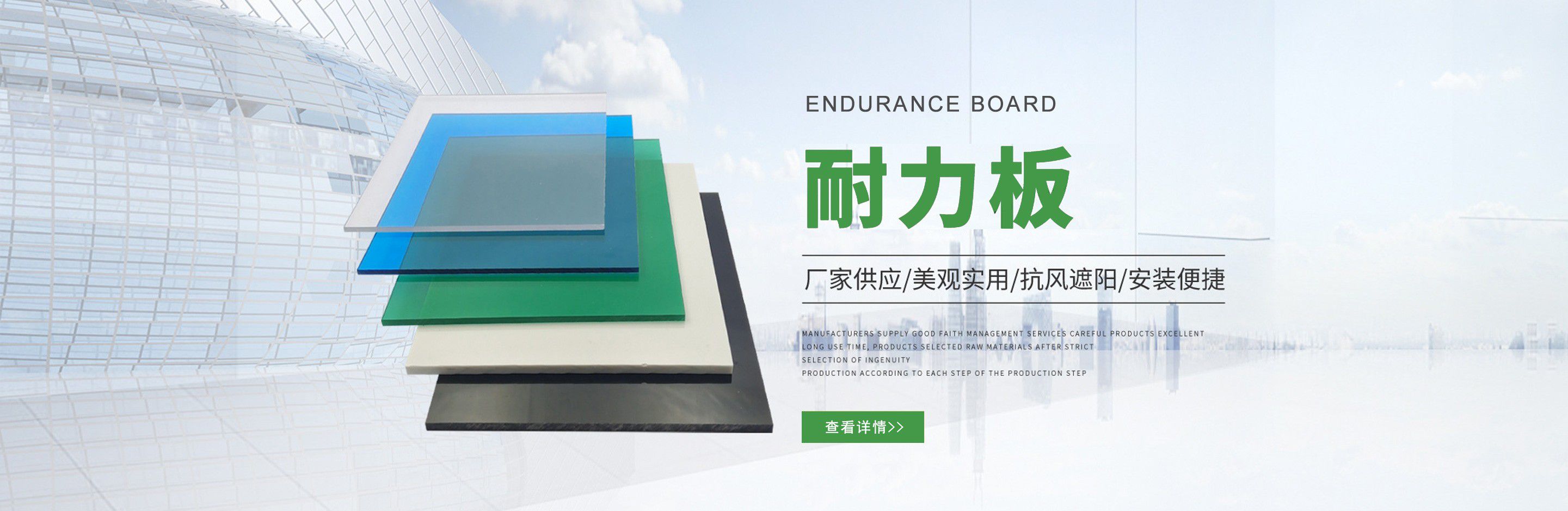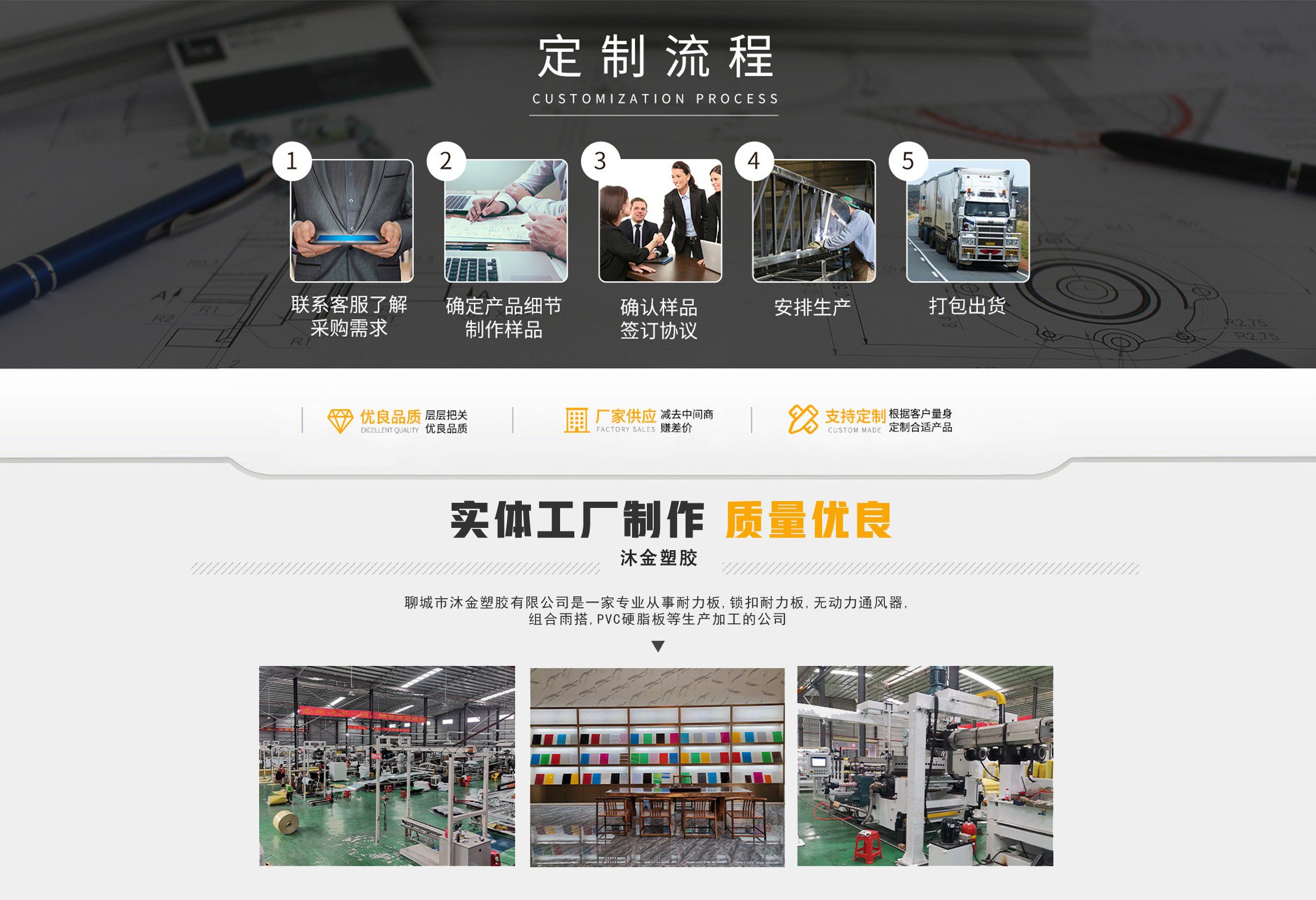 聊城市沐金塑膠有限公司注冊資金2180萬元,占地20000余平方,擁有自建廠房15000平方,員工100余名。10余年來,公司主營耐力板,鎖扣耐力板,耐力板深加工,無動力通風器,組合雨搭,PVC硬脂板,耐力板廠家等板材的發展戰略,逐漸成長為綜合性企業。 公司擁有多條板材共擠生產線,采用世界知名品牌進口原材料和先進工藝,依據完善的ISO9001質量管理體系和ISO14001環境管理體系,為產品的卓越品質提供了強有力的保證。憑借過硬的創新能力和堅實的硬件基礎,贏創已成為國內領先的熱塑性板材生產商,產品被廣泛應用于建筑業、農業、工業、廣告業、安防行業及DIY領域?! 」臼冀K致力于通過提供最優的板材應用解決方案,為客戶創造最高的價值;堅守創新、質量、靈活、服務和速度的核心價值觀;堅持“完美的產品需要完美服務的支持”的經營理念,努力實現成為世界領先的板材與解決方案供應商的夢想。 在未來,公司將立足客戶需求,不斷改變和完善現有產品,拓展產品線和充分開發板材的應用領域,為客戶創造全方位的價值。同時更好地實現員工的價值,實現公司團隊的價值。我們將與您一起創贏未來! 企業使命:成為世界領先的板材與解決方案供應商。 公司愿景:通過提供最優的板材應用解決方案,為客戶創造最高的價值?! 『诵膬r值觀:質量...